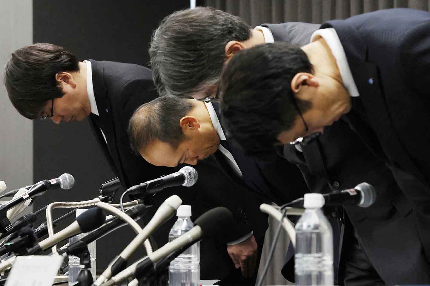 El presidente de Kobayashi Pharmaceutical Co., Akihiro Kobayashi (segundo por la izquierda), y otros inclinan la cabeza al comienzo de una conferencia de prensa en Osaka el 29 de marzo de 2024.
