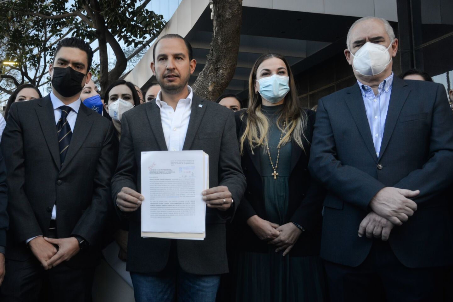 CIUDAD DE MÉXICO, 03FEBRERO2021.- Marko Cortés, dirigente nacional del PAN, Cecilia Patrón Laviada, diputada del PAN, Jorge Romero Herrera, diputado y coordinador del PAN; Julen Rementería, senador y coordinador del PAN, y legisladores panistas acudieron a las instalaciones de la Fiscalía General de la República (FGR) para presentar una denuncia para que se investiguen los contratos de la propiedad de José Ramón López Beltrán, hijo del presidente Andrés Manuel López Obrador, ubicada en Houston, Texas. FOTO: MARIO JASSO/CUARTOSCURO.COM