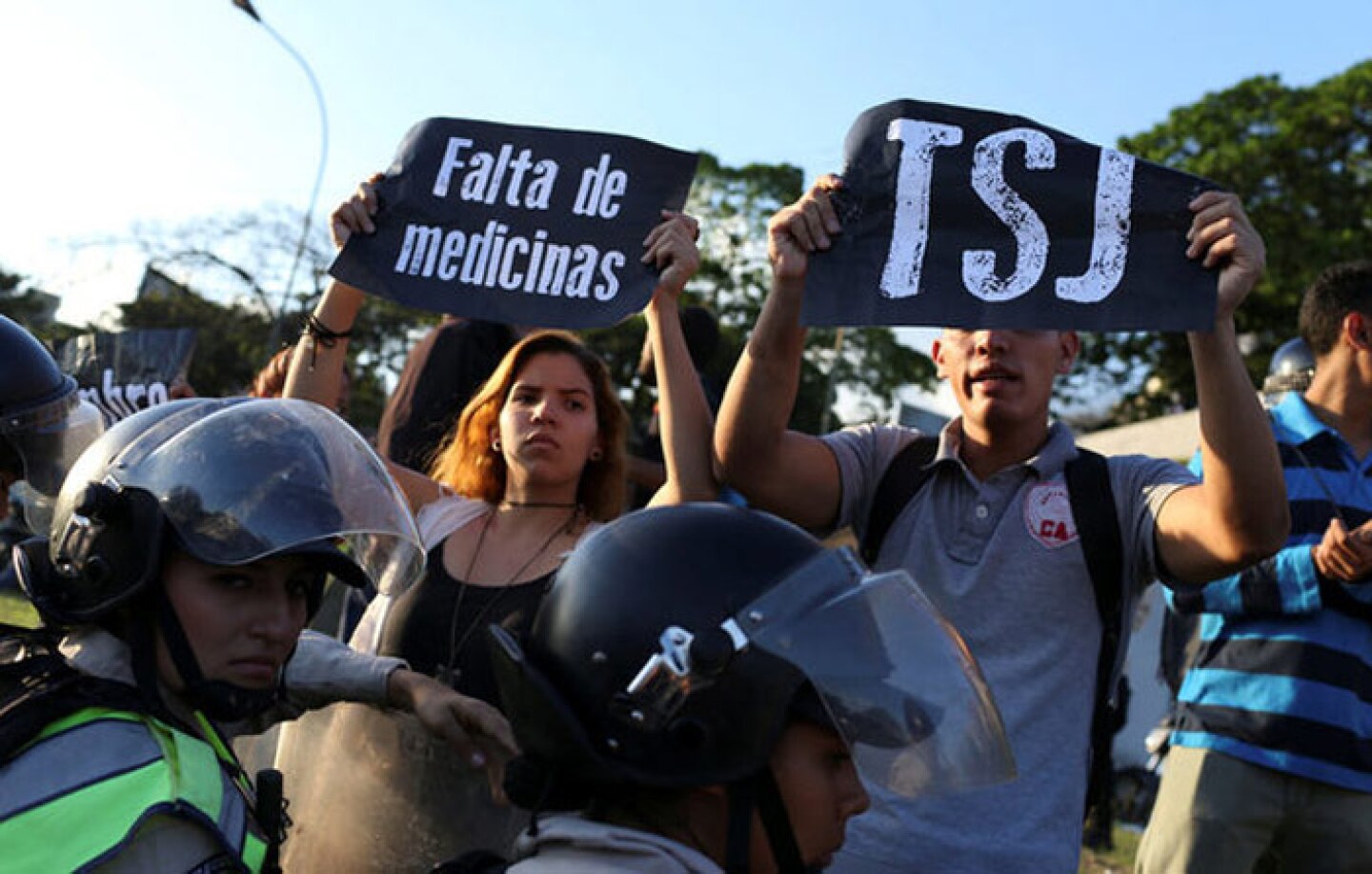 Partidarios de la oposición portan pancartas que denuncian la escasez de medicamentos en la república bolivariana.