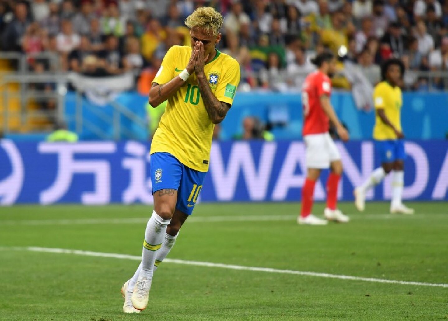 Brazil’s forward Neymar reacts during the Russia 2018 World Cup Group E football match between Brazil and Switzerland at the Rostov Arena in Rostov-On-Don on June 17, 2018. / AFP PHOTO / JOE KLAMAR / RESTRICTED TO EDITORIAL USE - NO MOBILE PUSH ALERTS/DOWNLOADS
