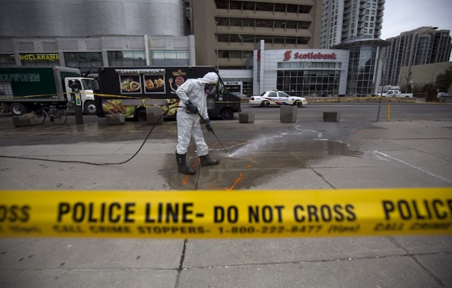 TORONTO, ON - APRIL 24: A hazmat worker scrubs the sidewalk of blood and debris in an outline of where a body laid after a mass killing on Yonge St. at Finch Ave. on April 24, 2018 in Toronto, Canada. A suspect identified as Alek Minassian, 25, is in custody after a driver in a white rental van drove into multiple pedestrians, killing 10 and injuring at least 16. Cole Burston/Getty Images/AFP
