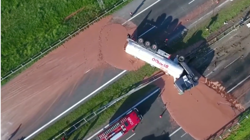 Un tráiler derramó toneladas del dulce líquido y caliente al volcarse tras choque vial