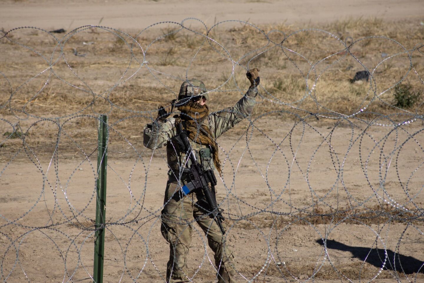 CIUDAD JUÁREZ, CHIHUAHUA, 21DICIEMBRE2022.- Elementos de la Guardia Nacional de Texas llegaron a las orillas del Río Bravo para instalar alambre de púas y vehículos antimotines a fin de evitar la entrada de personas en situación de indocumentados a territorio estadounidense. El objetivo de los caminantes es solicitar el asilo humanitario en los Estados Unidos para mejor sus condiciones de vida. FOTO: DAVID PEINADO/CUARTOSCURO.COM