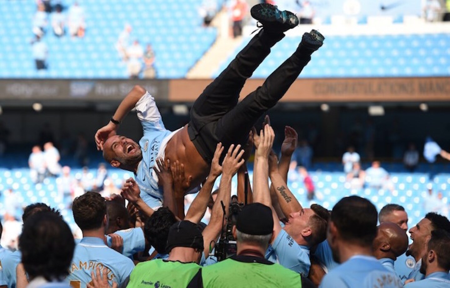 Manchester City’s Spanish manager Pep Guardiola is tossed by Manchester City players during the trophy ceremony after the English Premier League football match between Manchester City and Huddersfield Town at the Etihad Stadium in Manchester, north west England, on May 6, 2018. / AFP PHOTO / Oli SCARFF / RESTRICTED TO EDITORIAL USE. No use with unauthorized audio, video, data, fixture lists, club/league logos or ‘live’ services. Online in-match use limited to 75 images, no video emulation. No use in betting, games or single club/league/player publications. /