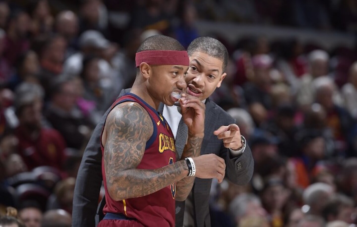 CLEVELAND, OH - JANUARY 28: Isaiah Thomas #3 of the Cleveland Cavaliers is coached by Head Coach Tyronn Lue of the Cleveland Cavaliers during the game against the Detroit Pistons on January 28, 2018 at Quicken Loans Arena in Cleveland, Ohio. NOTE TO USER: User expressly acknowledges and agrees that, by downloading and or using this Photograph, user is consenting to the terms and conditions of the Getty Images License Agreement. Mandatory Copyright Notice: Copyright 2018 NBAE David Liam Kyle/NBAE via Getty Images/AFP