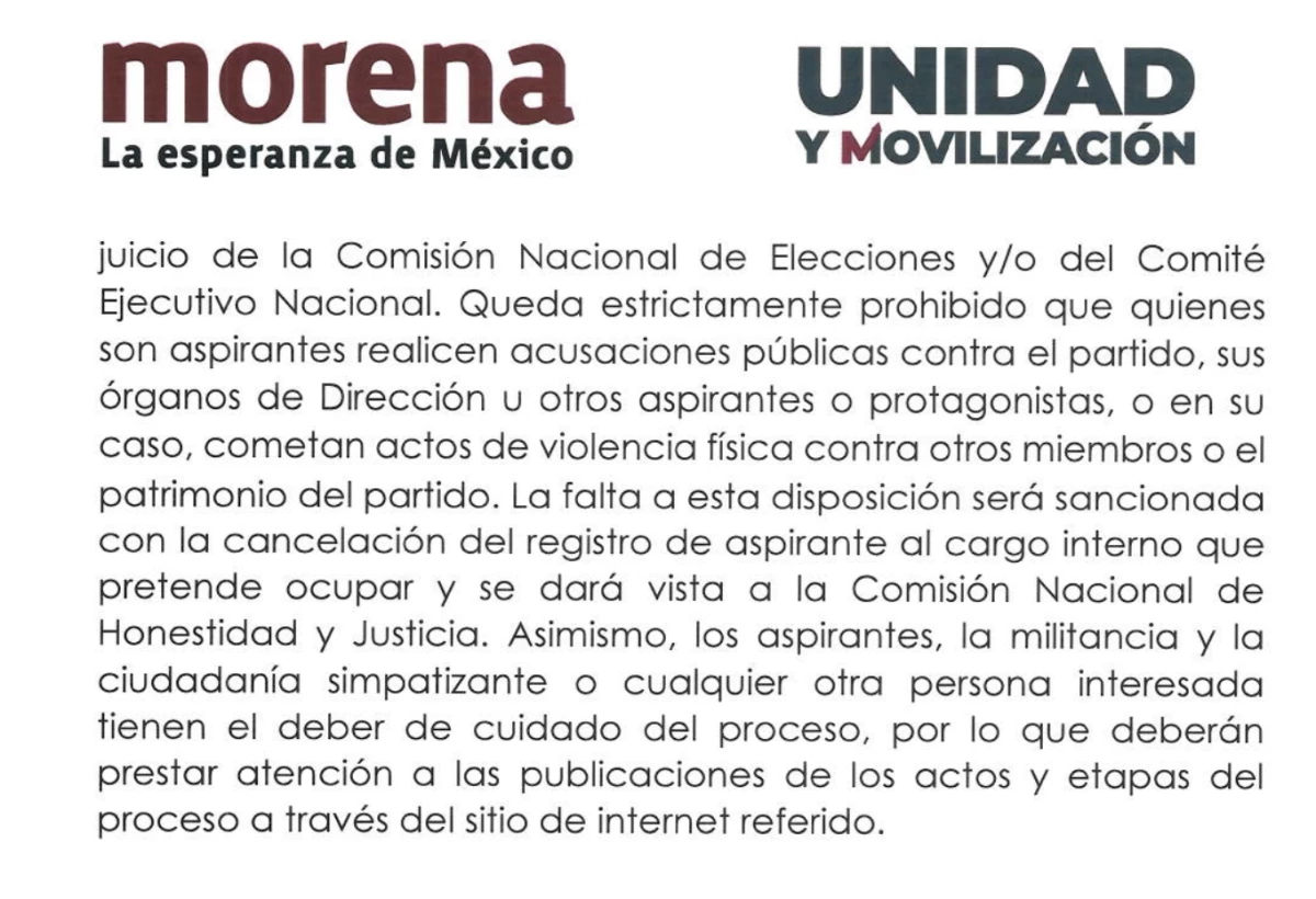 “Queda estrictamente prohibido que quienes son aspirantes realicen acusaciones públicas contra el partido, sus órganos de dirección y otros aspirantes o protagonistas”, dice la convocatoria.