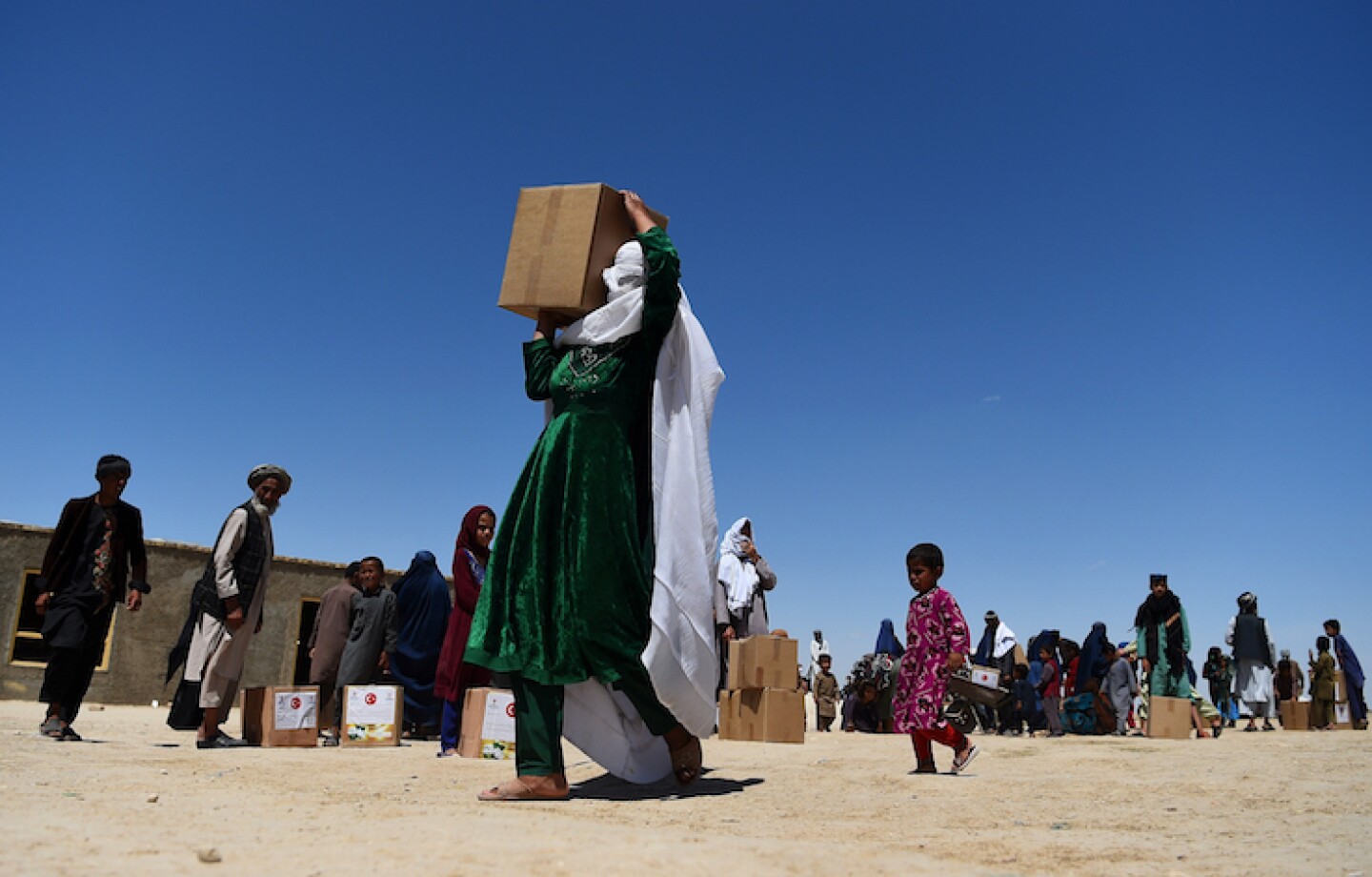 In this photograph taken on May 3, 2020, an internally displaced woman carries free aid over her shoulders distributed during the Holy month of Ramadan in a refugee camp on the outskirts of Mazar-i-Sharif. (Photo by FARSHAD USYAN / AFP)