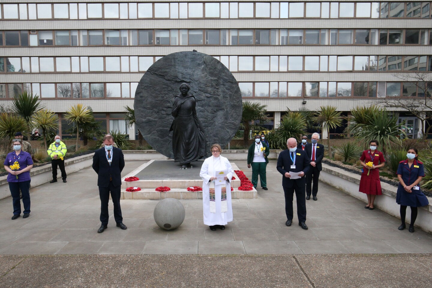 Chief Spiritual Adviser Mia Hilborn (C) stands with NHS England Chief Executive Sir Simon Stevens (CL) and Guys and St Thomas' NHS Trust Chief Executive and Chief Medical Officer Dr Ian Abbs (CR) during a ceremony to observe a minute's silence on the first anniversary of the first national Covid-19 lockdown, at St Thomas' Hospital, central London on March 23, 2021. - Britain on Tuesday marked the anniversary of its first coronavirus lockdown with a minute's silence in tribute to the more than 126,000 people who have died -- one of the world's worst tolls. (Photo by Jonathan Brady / POOL / AFP)