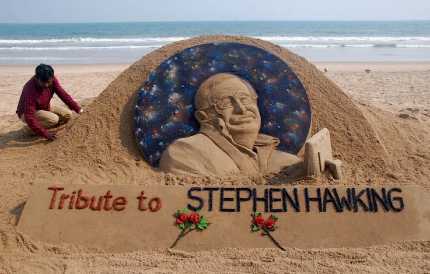 Sand artist Sudarsan Patnaik gives final touches to a sculpture in honour of British physicist and award-winning author Stephen Hawking at Puri beach, some 65 kms. from Bhubaneswar on March 14, 2018. Renowned British physicist Stephen Hawking, whose mental genius and physical disability made him a household name and inspiration across the globe, died on March 14th aged 76. Propelled to superstardom by his 1988 book “A Brief History of Time”, which became an unlikely worldwide bestseller, Hawking dedicated his life to unlocking the secrets of the Universe. / AFP PHOTO / ASIT KUMAR