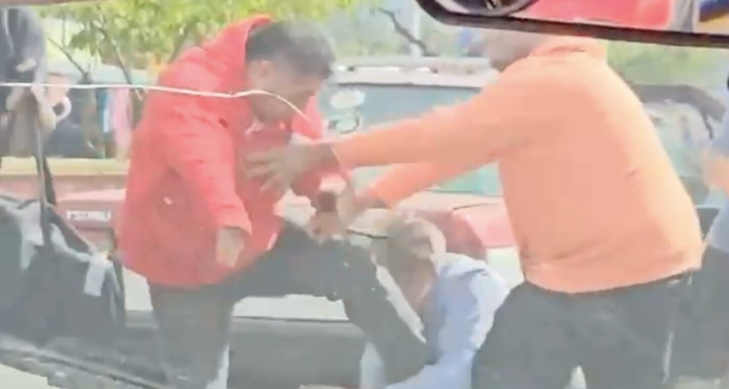 En las imágenes, se observa al conductor, vestido con una sudadera roja, pateando y golpeando a un hombre de la tercera edad. Los pasajeros de la unidad de alquiler abandonaron rápidamente el taxi y huyeron del lugar.